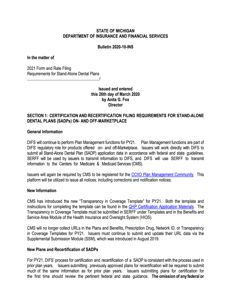 STATE OF MICHIGAN DEPARTMENT OF INSURANCE AND FINANCIAL SERVICES Bulletin 202010INS In the matter of 2021 Form and Rate Filing Requirements for StandAlone Dental Plans /Issued and entered this 26th