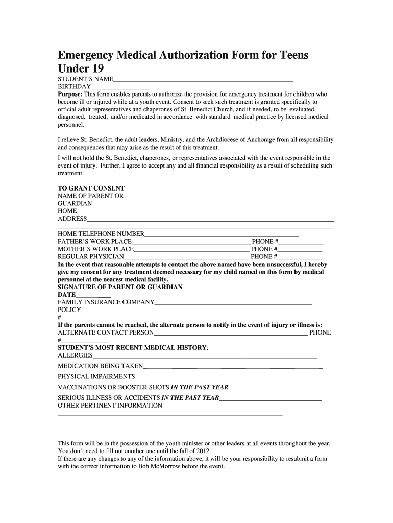 PRINT Emergency Medical Authorization Form for Teens Under 19 STUDENT S NAME BIRTHDAY Purpose: This form enables parents to authorize the provision for emergency treatment for children who become