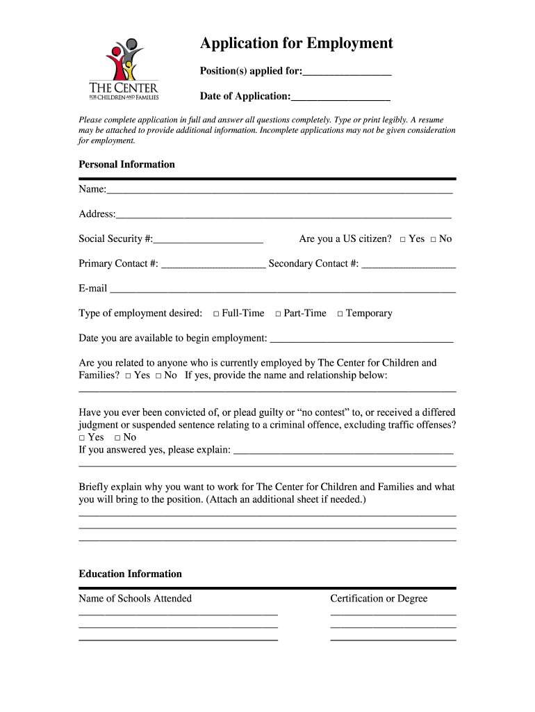 Get the free Application for Employment - standforhope.org