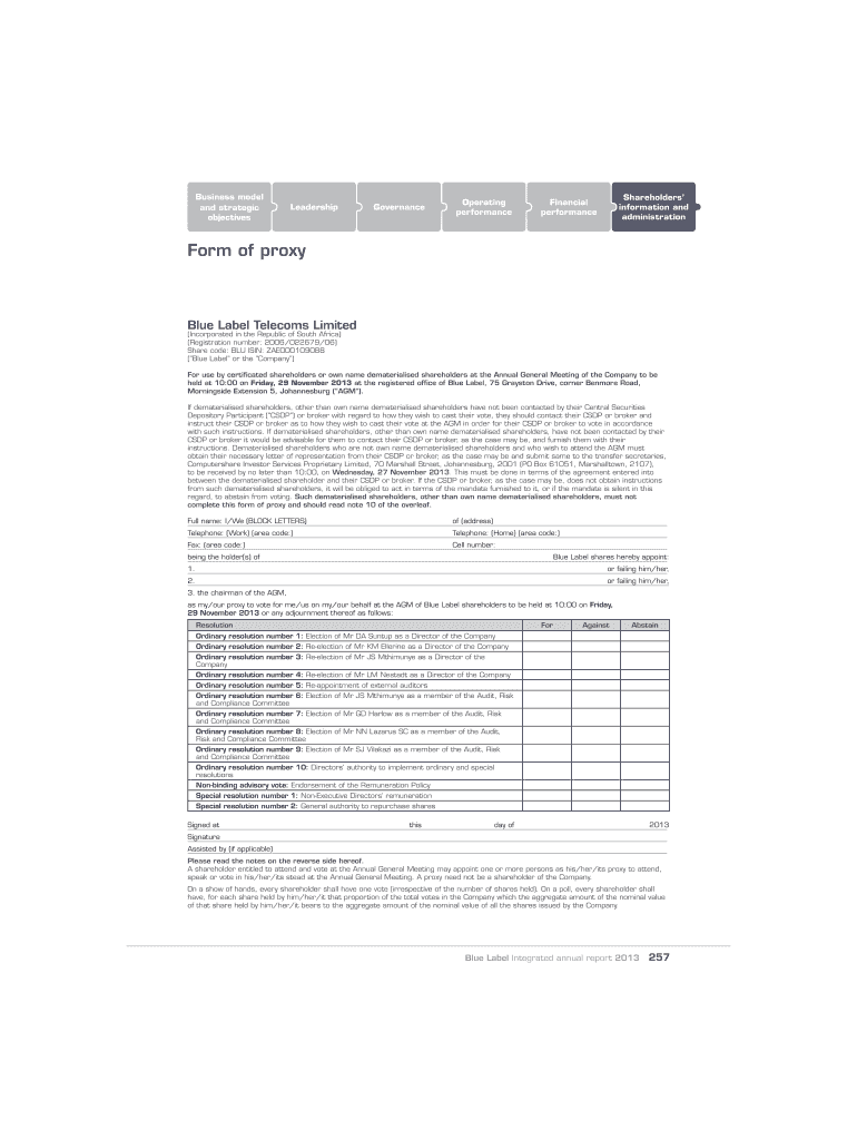 The Blue Label Proxy Form is intended for shareholders of Blue Label Telecoms Limited. Only individuals who own shares in the company can use this form to appoint a proxy for voting at the AGM.