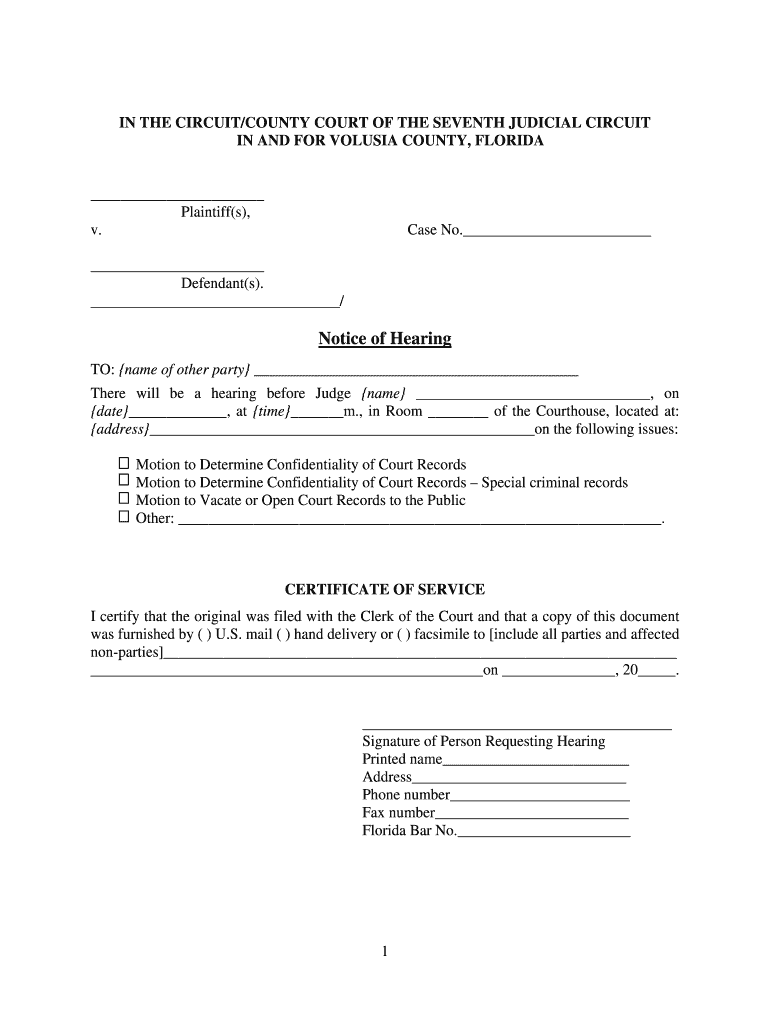 IN THE CIRCUIT/COUNTY COURT OF THE SEVENTH JUDICIAL CIRCUIT IN AND FOR VOLUSIA COUNTY, FLORIDA Plaintiff(s), v. Case No. Defendant(s). /Notice of Hearing TO: name of other party There will be a hearing