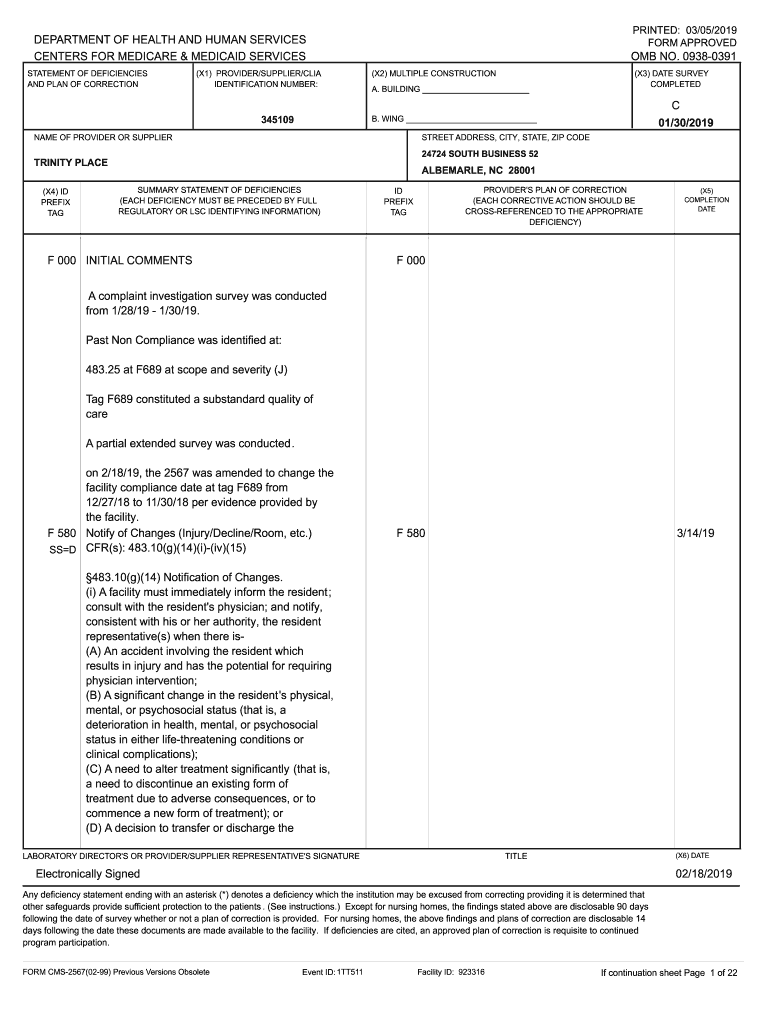 PRINTED: 03/05/2019 FORM APPROVEDDEPARTMENT OF HEALTH AND HUMAN SERVICES CENTERS FOR MEDICARE & MEDICAID SERVICES STATEMENT OF DEFICIENCIES AND PLAN OF CORRECTION(X1) PROVIDER/SUPPLIER/CIA IDENTIFICATION