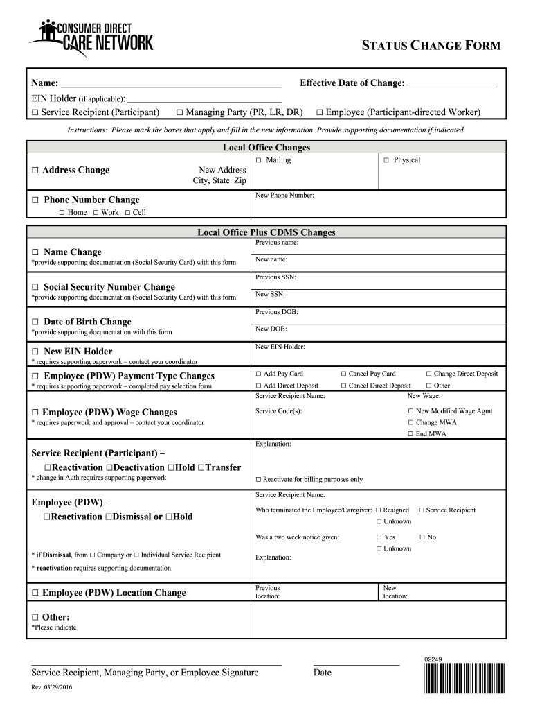 STATUS CHANGE FORM Name:Effective Date of Change:EIN Holder (if applicable): Service Recipient (Participant) Managing Party (PR, LR, DR) Employee (Participant directed Worker)Instructions: Please