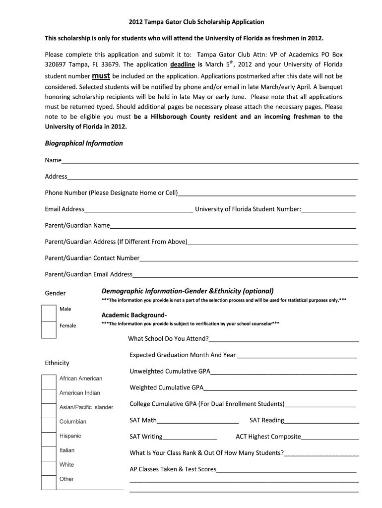 How to fill out 2012 Tampa Gator Club Scholarship Application