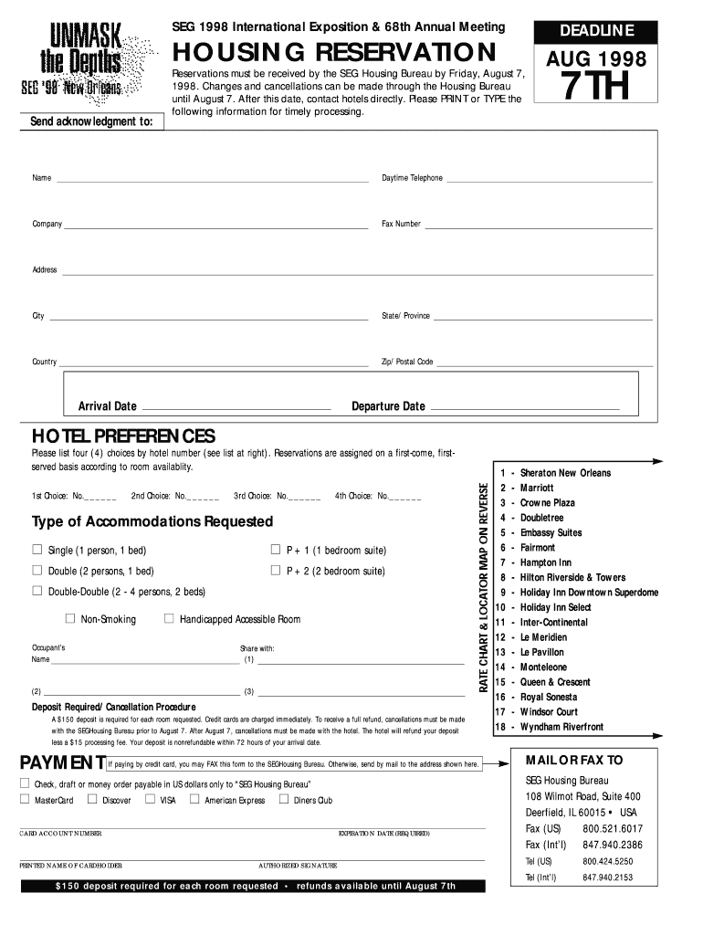 SEG 1998 International Exposition & 68th Annual Meeting HOUSING RESERVATION Send acknowledgment to: DEADLINE AUG 1998 Reservations must be received by the SEG Housing Bureau by Friday, August 7, 1998.