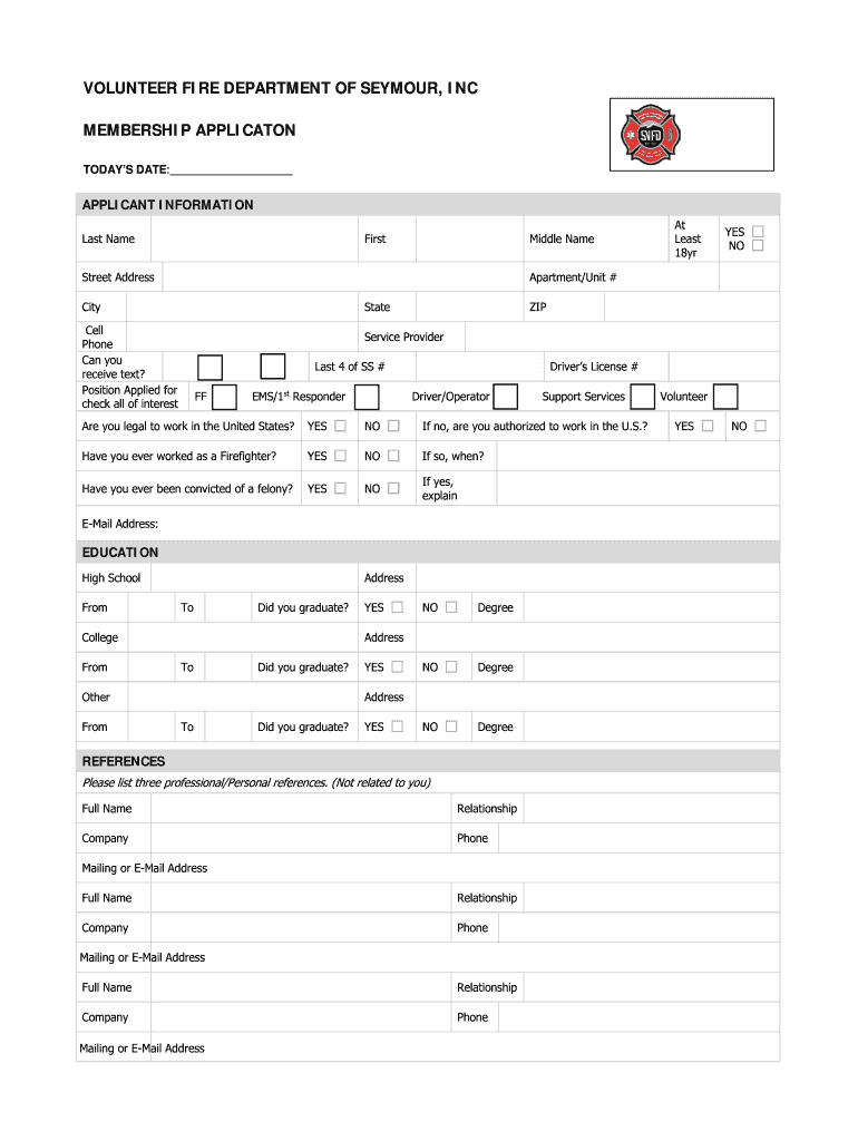 VOLUNTEER FIRE DEPARTMENT OF SEYMOUR, INC MEMBERSHIP APPLICATION TODAYS DATE: APPLICANT INFORMATION Last NameFirstMiddle Backstreet Address Statement Phone Can you receive text? Position Applied for