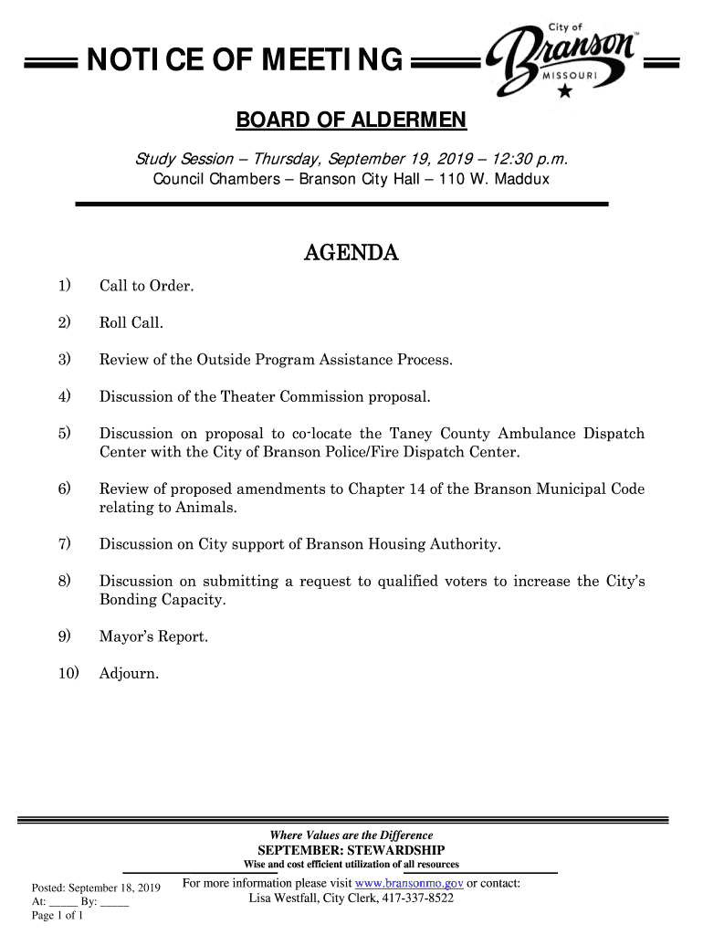 NOTICE OF MEETING BOARD OF ALDERMEN Study Session Thursday, September 19, 2019 12:30 p.m. Council Chambers Branson City Hall 110 W. MadduxAGENDA 1)Call to Order.2)Roll Call.3)Review of the Outside