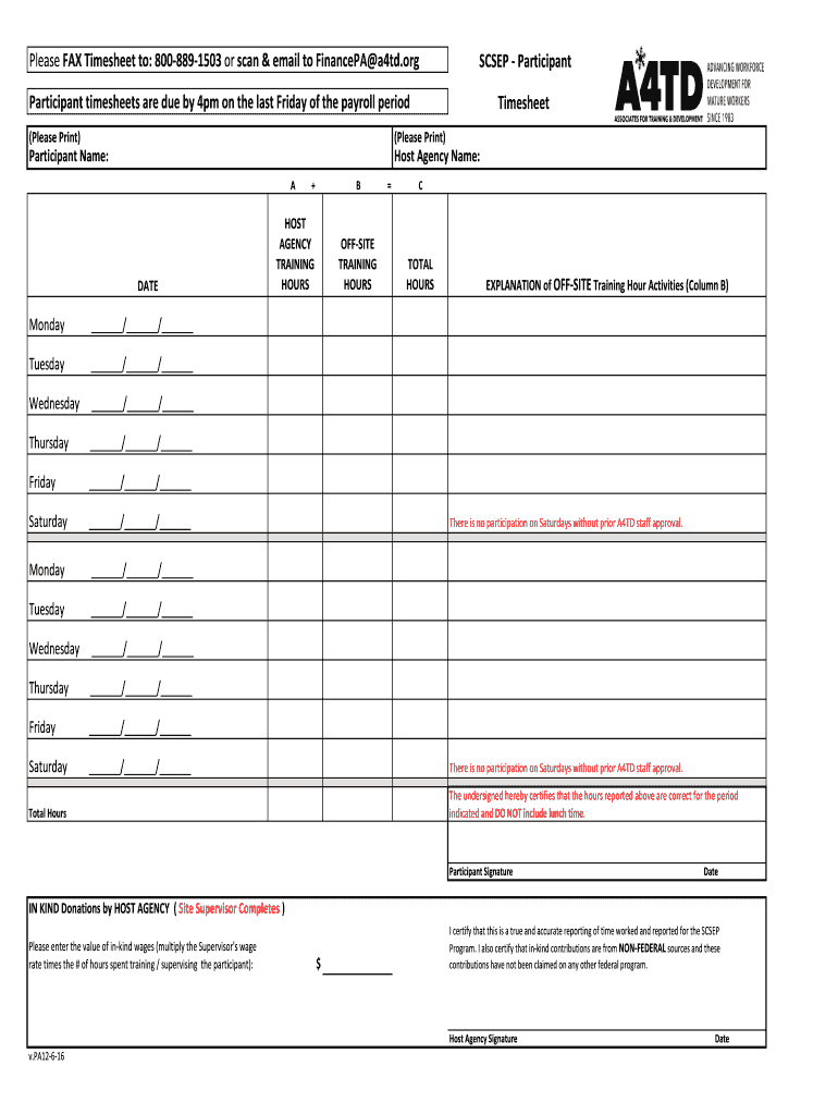 Please FAX Timesheet to: 8008891503 or scan & email to Finance PA a4td.orgSCSEP ParticipantParticipant timesheets are due by 4pm on the last Friday of the payroll periodTimesheet(Please Print)(Please