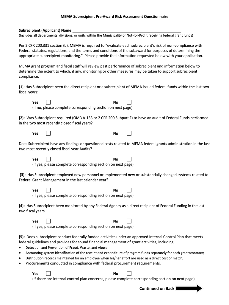 MEMO Subrecipient Reward Risk Assessment Questionnaire Subrecipient (Applicant) Name: (Includes all departments, divisions, or units within the Municipality or NotforProfit receiving federal grant