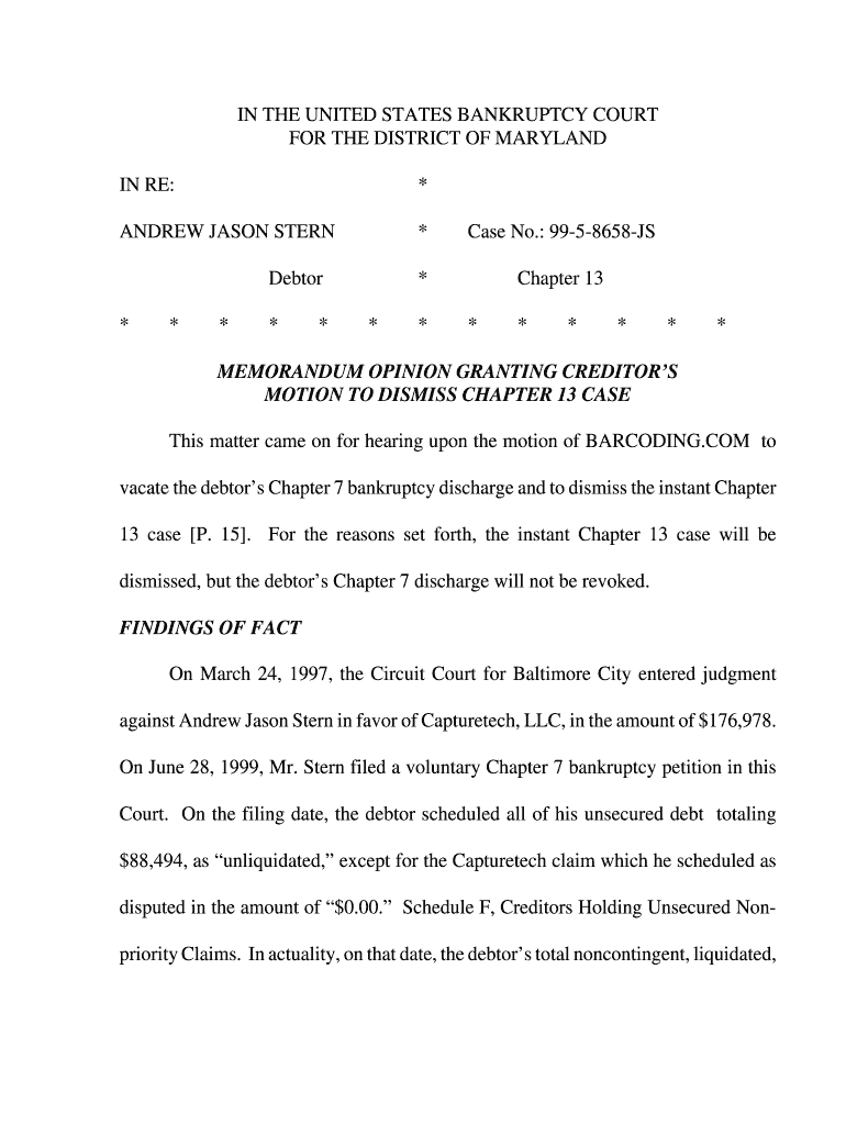 IN THE UNITED STATES BANKRUPTCY COURT FOR THE DISTRICT OF MARYLAND IN RE:*ANDREW JASON STERN×Case No.: 9958658JS×Chapter 13Debtor *************MEMORANDUM OPINION GRANTING CREDITORS MOTION TO DISMISS