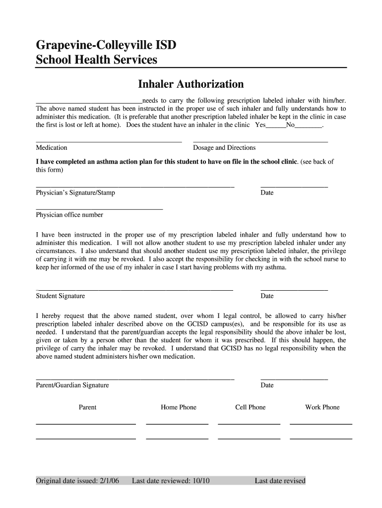 The Inhaler Authorization Form must be completed by the student's physician, who prescribes the inhaler, along with signatures from the student and a parent or guardian.