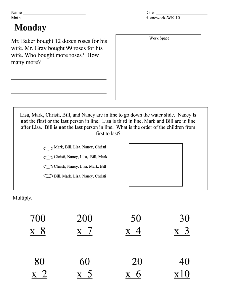 The Math Homework WK 10 worksheet typically includes problems related to addition, subtraction, multiplication, and logical reasoning formatted for students' understanding.
