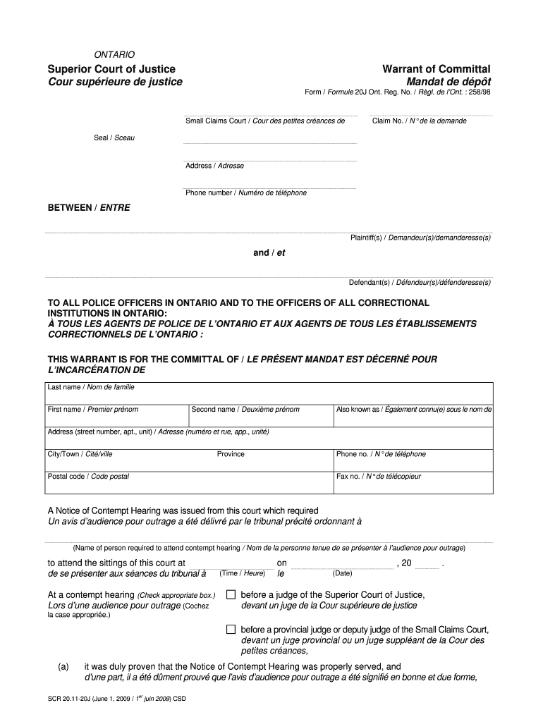 ONTARIO Superior Court of Justice Four sup Moore de justice Warrant of Committal Mandate de d p t Form / Formula 20J Ont. Reg. No. / R GL. de l Ont. 258/98 Small Claims Court / Four DES petites CR