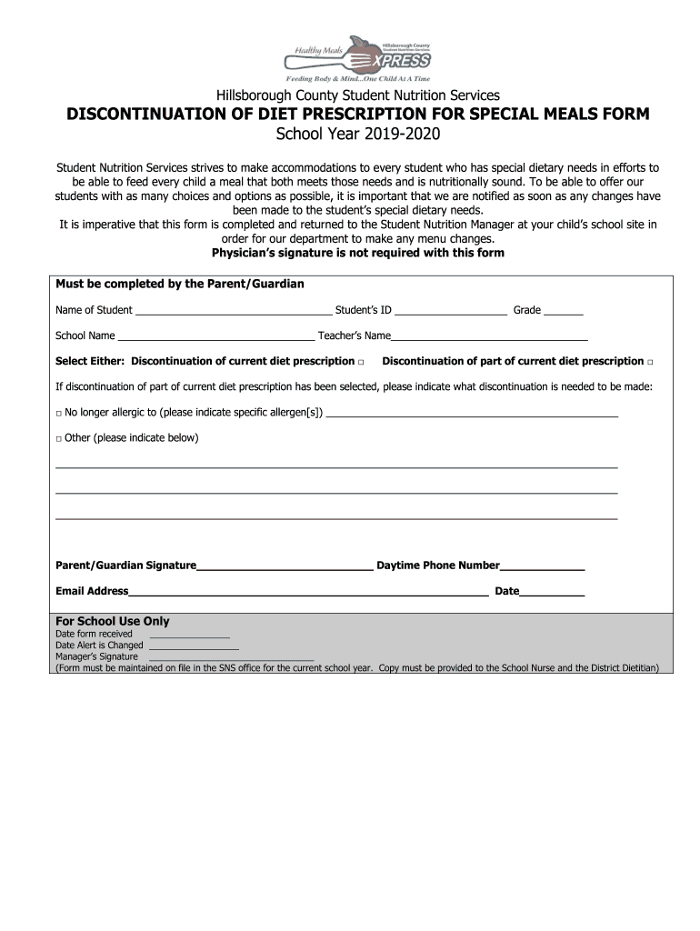 Hillsborough County Student Nutrition ServicesDISCONTINUATION OF DIET PRESCRIPTION FOR SPECIAL MEALS FORM
