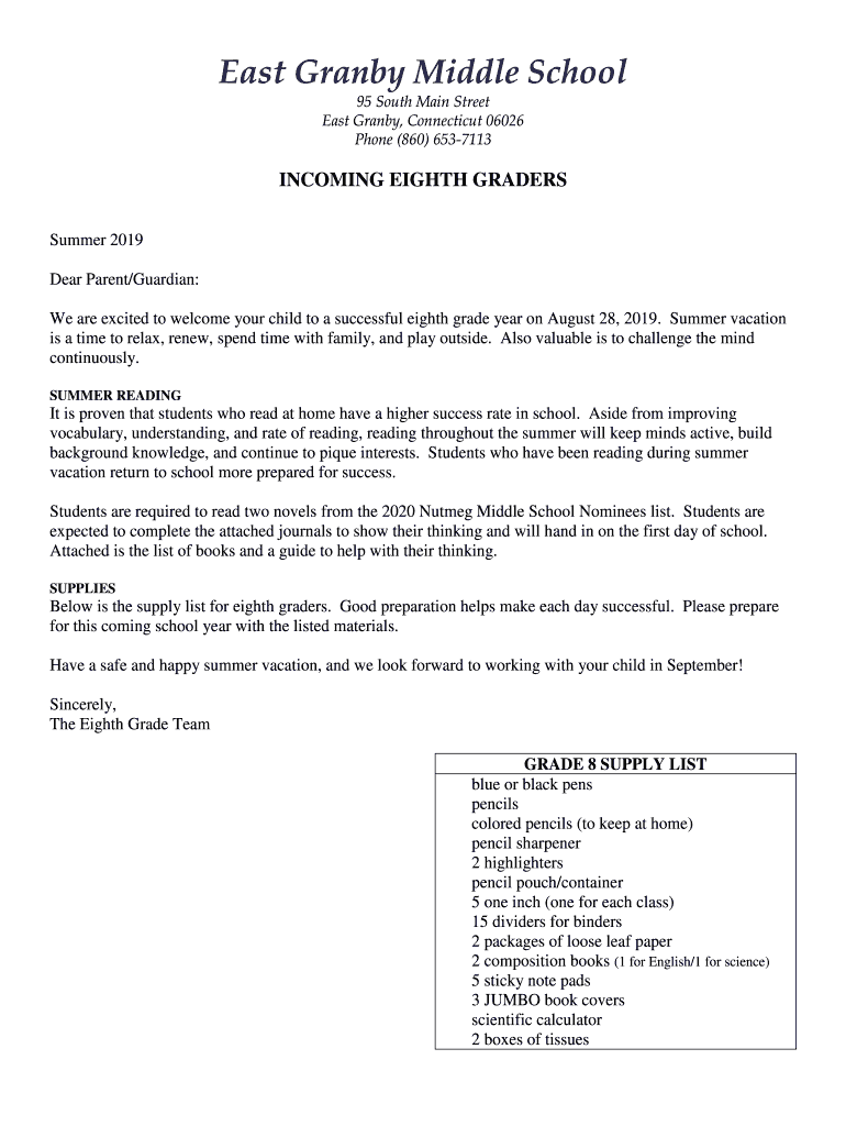 Phone (860) 6537113INCOMING EIGHTH GRADERS