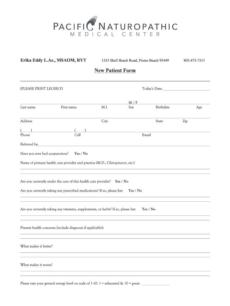 Erika Eddy L. Ac., MS AOM, RYT1353 Shell Beach Road, Pis mo Beach 934498054737311New Patient Form (PLEASE PRINT LEGIBLY)Last nameTodays Date:First headdress () Phone/F Seem. I. BirthdateCity (Cellmate)