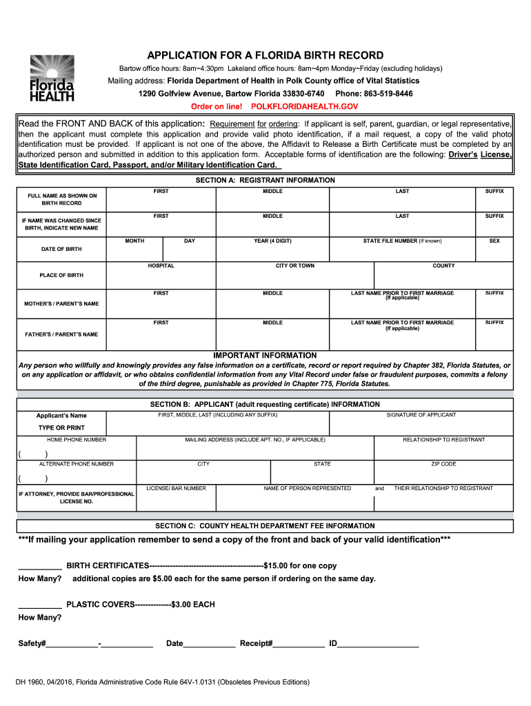 APPLICATION FOR A FLORIDA BIRTH RECORD