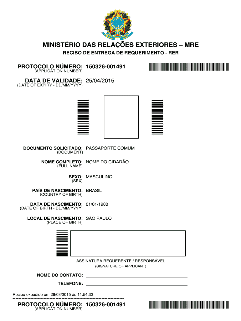 Documento que comprova a entrega de um requerimento para a solicitação de um passaporte comum.