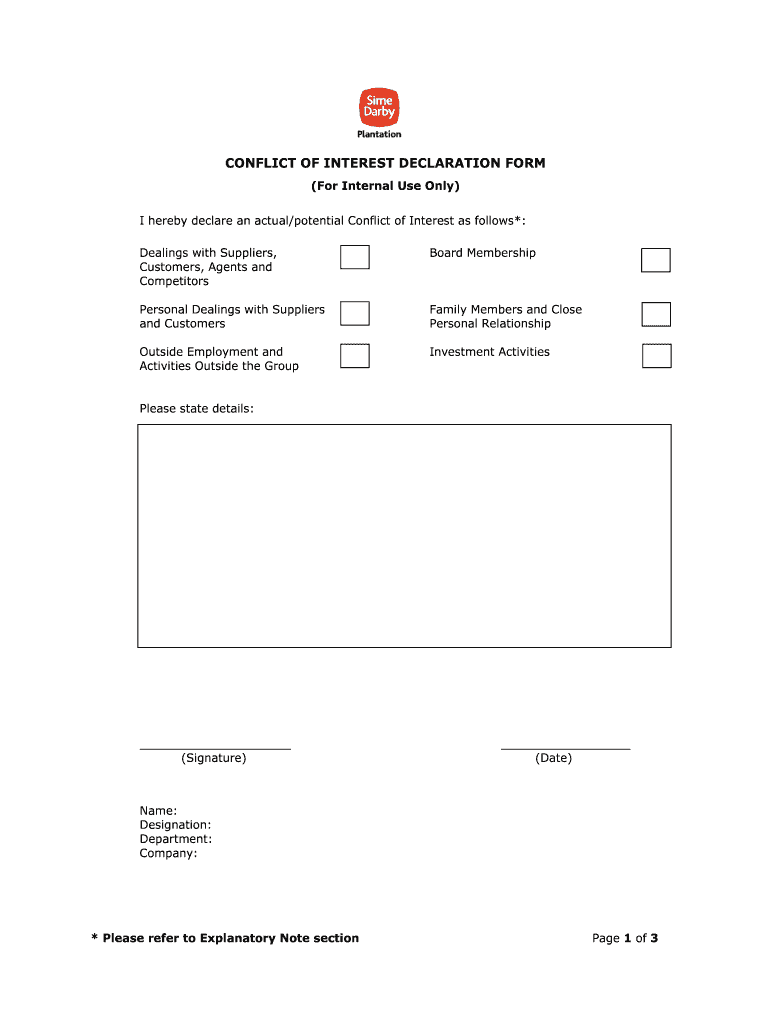 CONFLICT OF INTEREST DECLARATION FORM (For Internal Use Only) I hereby declare an actual/potential Conflict of Interest as follows*: Dealings with Suppliers, Customers, Agents and CompetitorsBoard