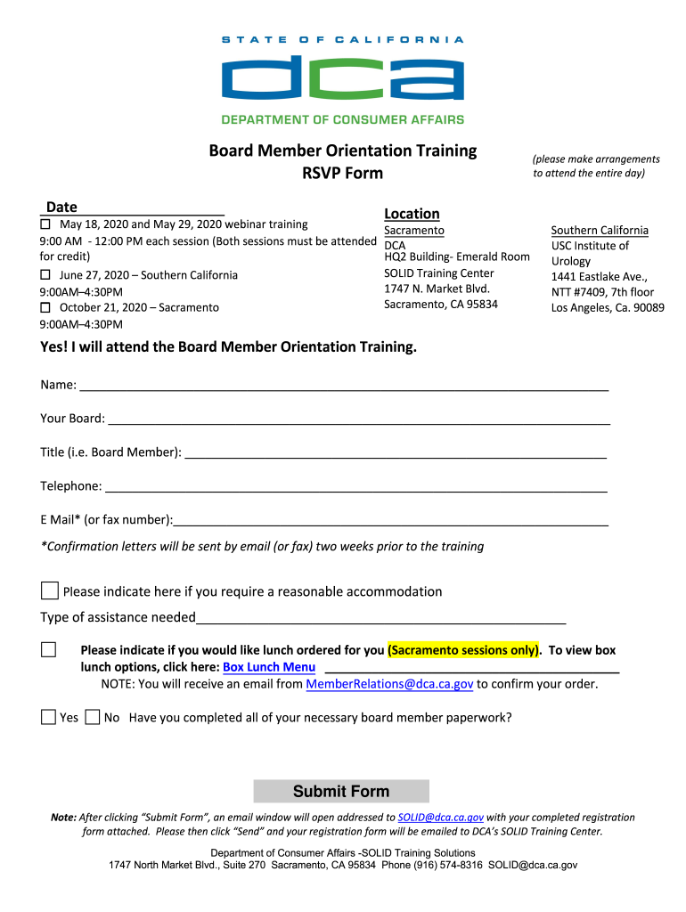 Board Member Orientation Training RSVP Form Date May 18, 2020, and May 29, 2020, webinar training 9:00 AM 12:00 PM each session (Both sessions must be attended for credit) June 27, 2020, Southern