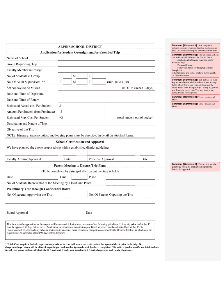 Save Comment Comment1 : You can jump to different sections Overnight Trip files by depressing Edit, Got and choosing the appropriate bookmark. ALPINE SCHOOL DISTRICT Application for Student Overnight
