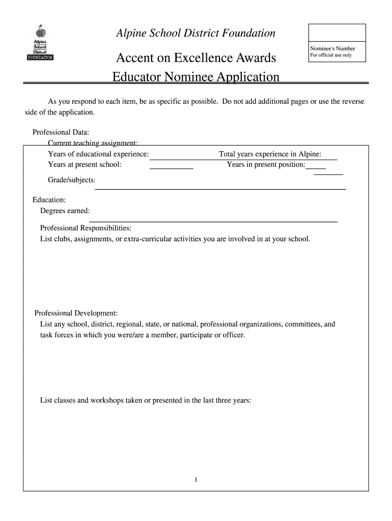 Alpine School District Foundation Nominee's Number Accent on Excellence Awards Educator Nominee Application For official use only As you respond to each item, be as specific as possible. Do not add