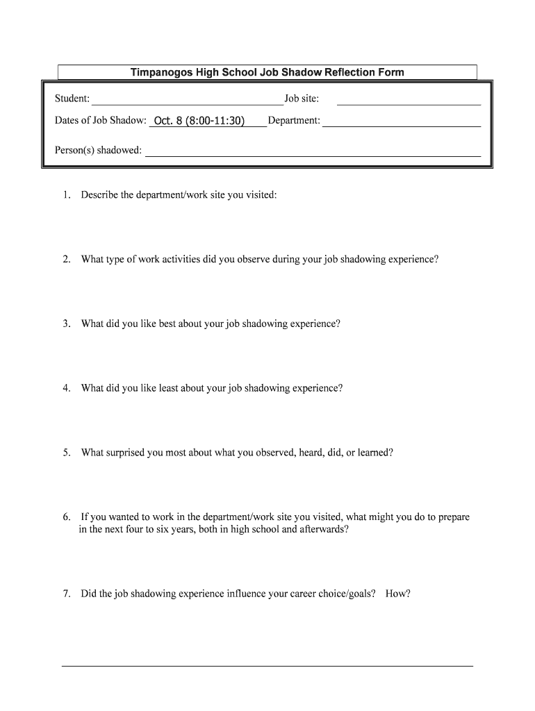 Timpanists High School Job Shadow Reflection Form Student: Dates of Job Shadow: Oct. 8 (8:00-11:30) Job site: Department: Person(s) shadowed: 1. Describe the department/work site you visited: 2. What
