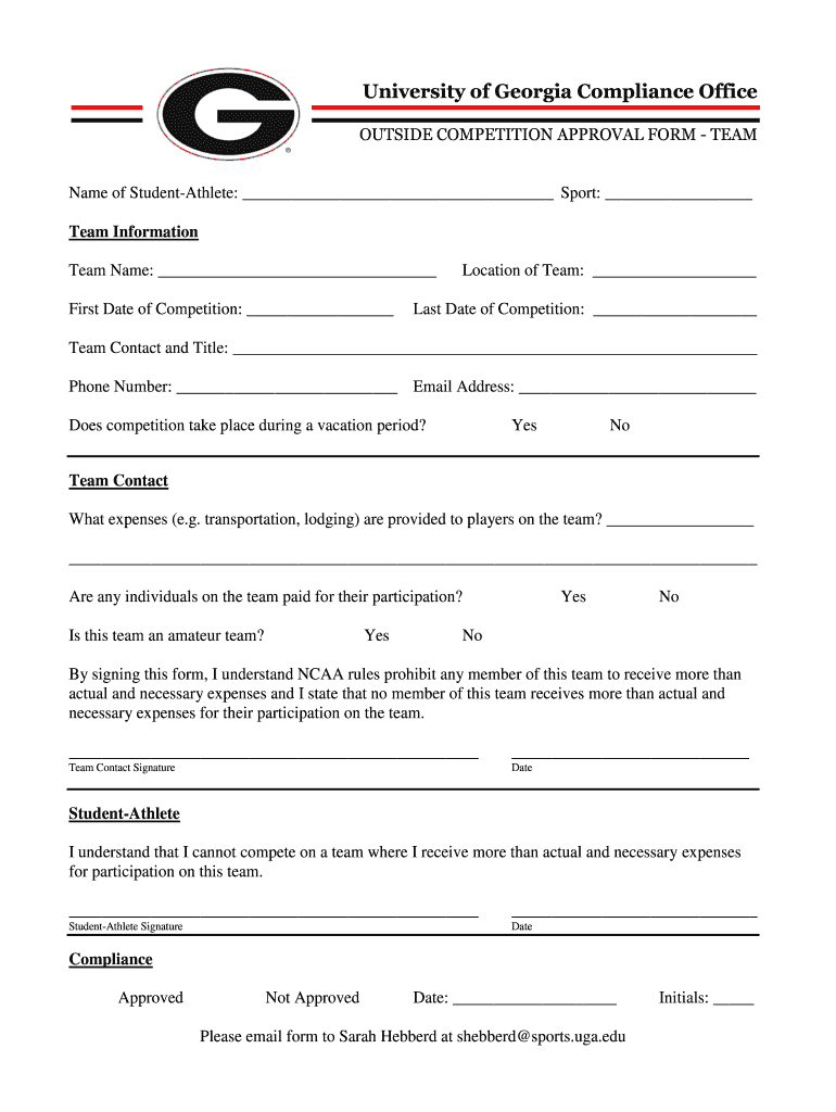 University of Georgia Compliance Office OUTSIDE COMPETITION APPROVAL FORM Teammate of StudentAthlete: Sport: Team Information Team Name: First Date of Competition: Location of Team: Last Date of Competition: