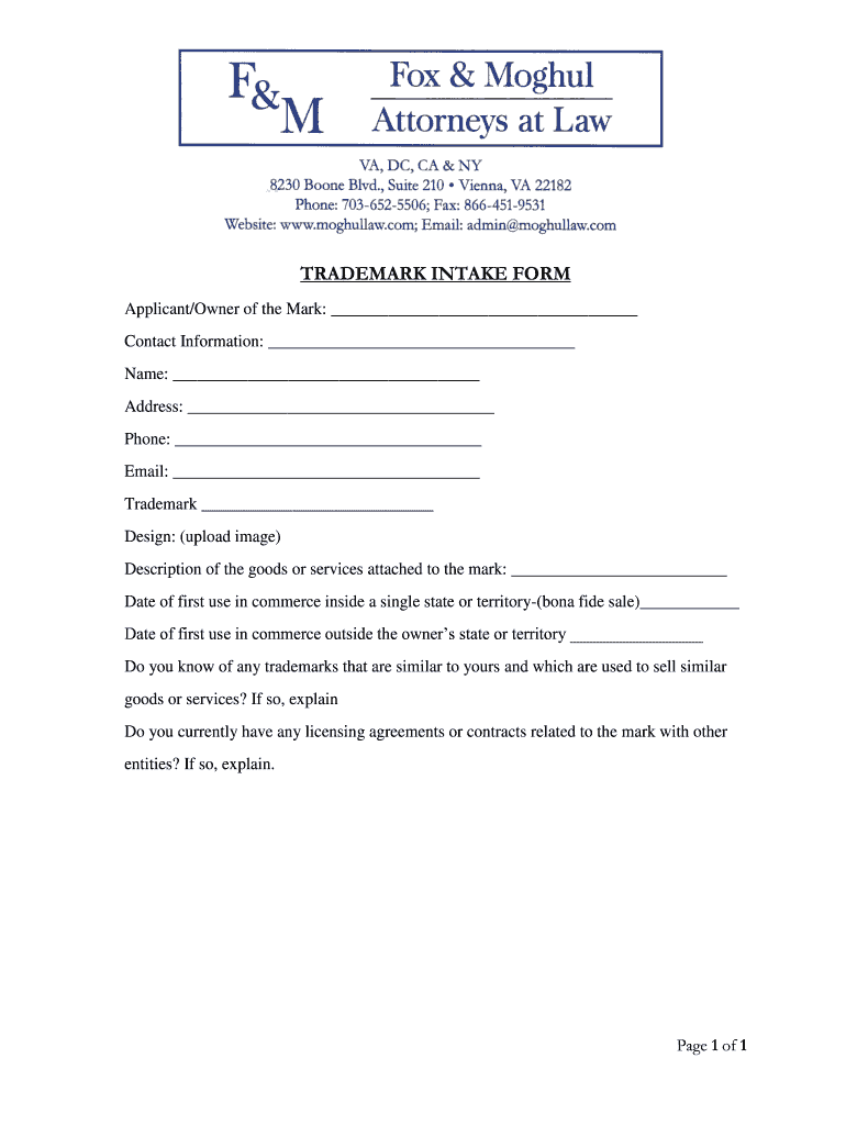 TRADEMARK INTAKE FORM Applicant/Owner of the Mark: Contact Information: Name: Address: Phone: Email: Trademark Design: (upload image) Description of the goods or services attached to the mark: Date