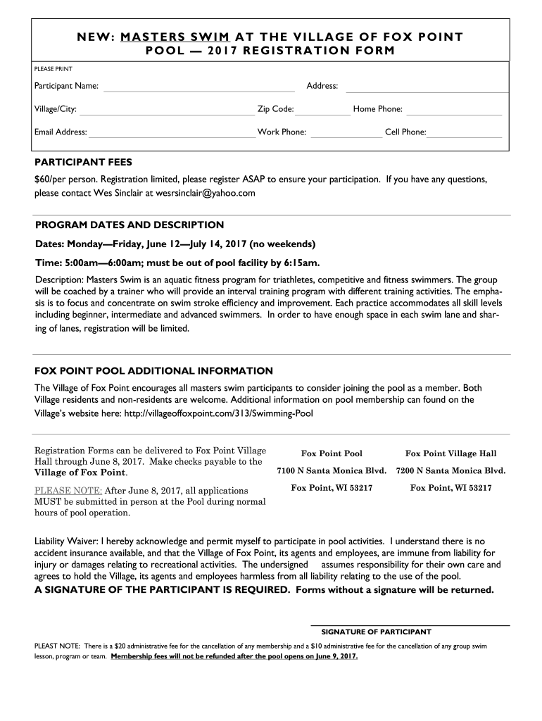 NEW: MASTERS SWIM AT THE VILLAGE OF FOX POINT POOL 2017 REGISTRATION FORM PLEASE PRINTParticipant Name:Address:Village/City:Zip Code:Home Phone:Email Address:Work Phone:Cell Phone:PARTICIPANT FEES