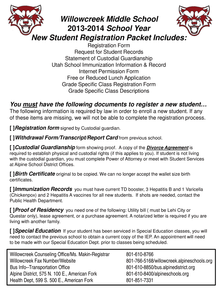 Willow creek Middle School 2013-2014 School Year New Student Registration Packet Includes: Registration Form Request for Student Records Statement of Custodial Guardianship Utah School Immunization