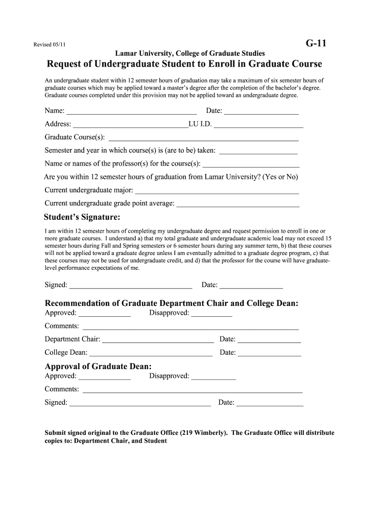 G11Revised 05/11Lamar University, College of Graduate StudiesRequest of Undergraduate Student to Enroll in Graduate Course An undergraduate student within 12 semester hours of graduation may take