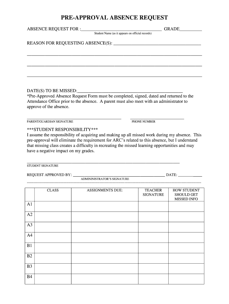 The Pre-Approval Absence Request Form is essential for obtaining permission from school authorities for students to be absent. This form plays a crucial role in educational settings by facilitating communication between students, parents, and school administrators. To ensure the process is complete, it requires signatures from the parent/guardian, student, and administrator, thereby validating the request. The completed form must be submitted to the Attendance Office before the intended absence.