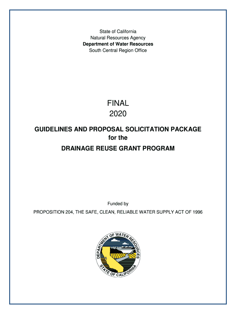 State of California Natural Resources Agency Department of Water Resources South Central Region Official 2020 GUIDELINES AND PROPOSAL SOLICITATION PACKAGE for the DRAINAGE REUSE GRANT PROGRAMFunded