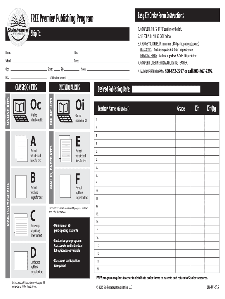 Easy Kit Order Form InstructionsFREE Premier Publishing Program1. COMPLETE THE SHIP TO section on the left. 2. SELECT PUBLISHING DATE below. 3. CHOOSE YOUR KITS. (A minimum of 80 participating students)