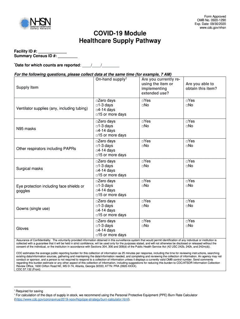Form Approved OMB No. 09201290 Exp. Date: 09/30/2020 www.cdc.gov/nhsnCOVID19 Module Healthcare Supply Pathway Facility ID #: Summary Census ID #: *Date for which counts are reported: / / For the following
