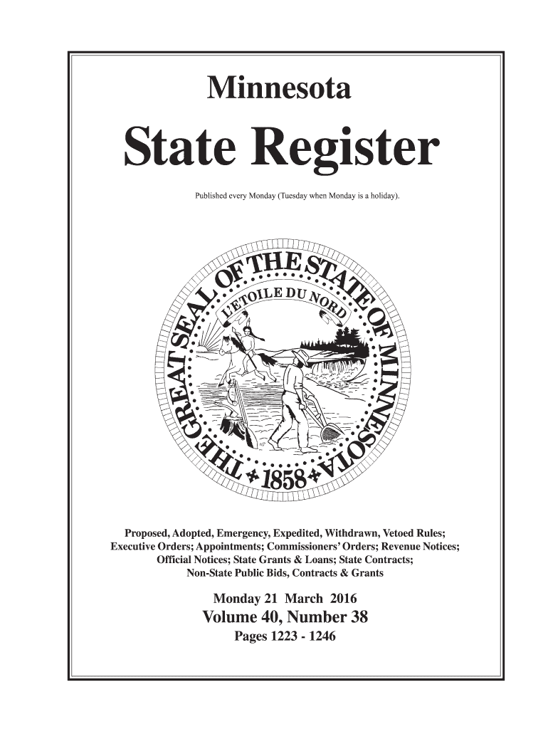 MinnesotaState Register Published every Monday (Tuesday when Monday is a holiday). Proposed, Adopted, Emergency, Expedited, Withdrawn, Vetoed Rules; Executive Orders; Appointments; Commissioners Orders;