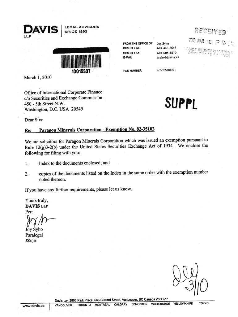 FROM THE OFFICE OFJoyDIRECTLINE604.443.2643DIRECTFAX604.605.4879EMAILFILE10015337MarchOfficedojsyhodavis.ca6795200001NUMBER2010of InternationalSecuritiesCorporateN. W