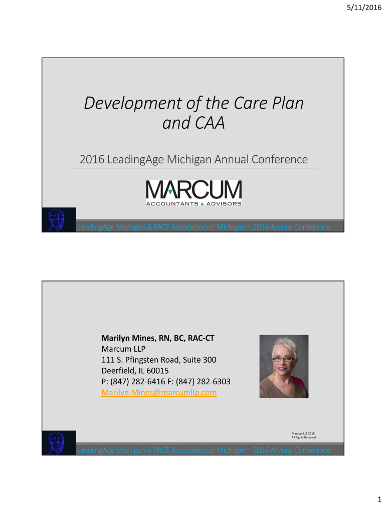5/11/2016DevelopmentoftheCarePlan and CAA 2016LeadingAgeMichiganAnnualConferenceLeadingAgeMichigan&PACEAssociationofMichigan2016AnnualConferenceMarilynMines,RN, BC, ACCT Marcella 111S. Kingston Road,Suite300