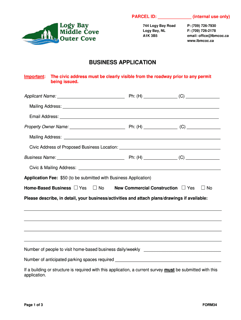 PARCEL ID: (internal use only) 744 Logy Bay Road Logy Bay, NL A1K 3B5P: (709) 7267930 F: (709) 7262178 email: office Lompoc.ca www.lbmcoc.caBUSINESS APPLICATION Important:The civic address must be