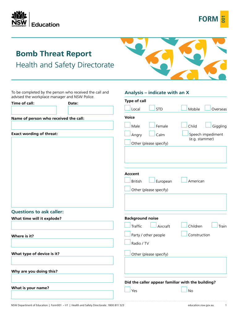 001FORMBomb Threat Report Health and Safety Directorate be completed by the person who received the call and advised the workplace manager and NSW Police. Time of call:Date:Analysis indicate with