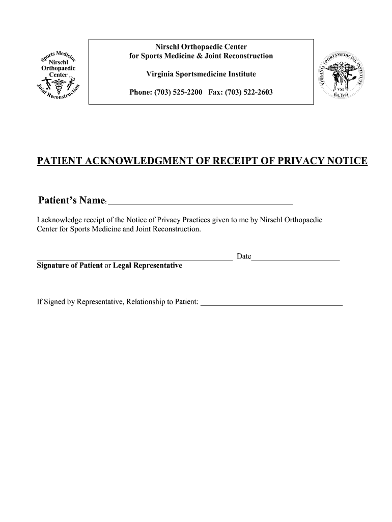 Kirsch Orthopedic Center for Sports Medicine & Joint Reconstruction Virginia Sports medicine Institute Phone: (703) 5252200 Fax: (703) 5222603PATIENT ACKNOWLEDGMENT OF RECEIPT OF PRIVACY NOTICEPatients