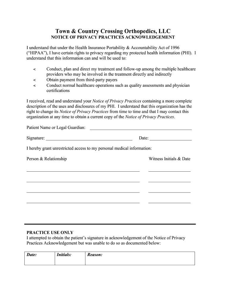 Town & Country Crossing Orthopedics, LLC NOTICE OF PRIVACY PRACTICES ACKNOWLEDGEMENT I understand that under the Health Insurance Portability & Accountability Act of 1996 (HIPAA), I have certain rights