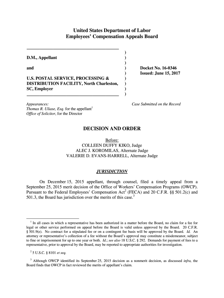 United States Department of Labor Employees Compensation Appeals Board D.M., Appellant and U.S. POSTAL SERVICE, PROCESSING & DISTRIBUTION FACILITY, North Charleston, SC, Employer)))))))))Appearances: