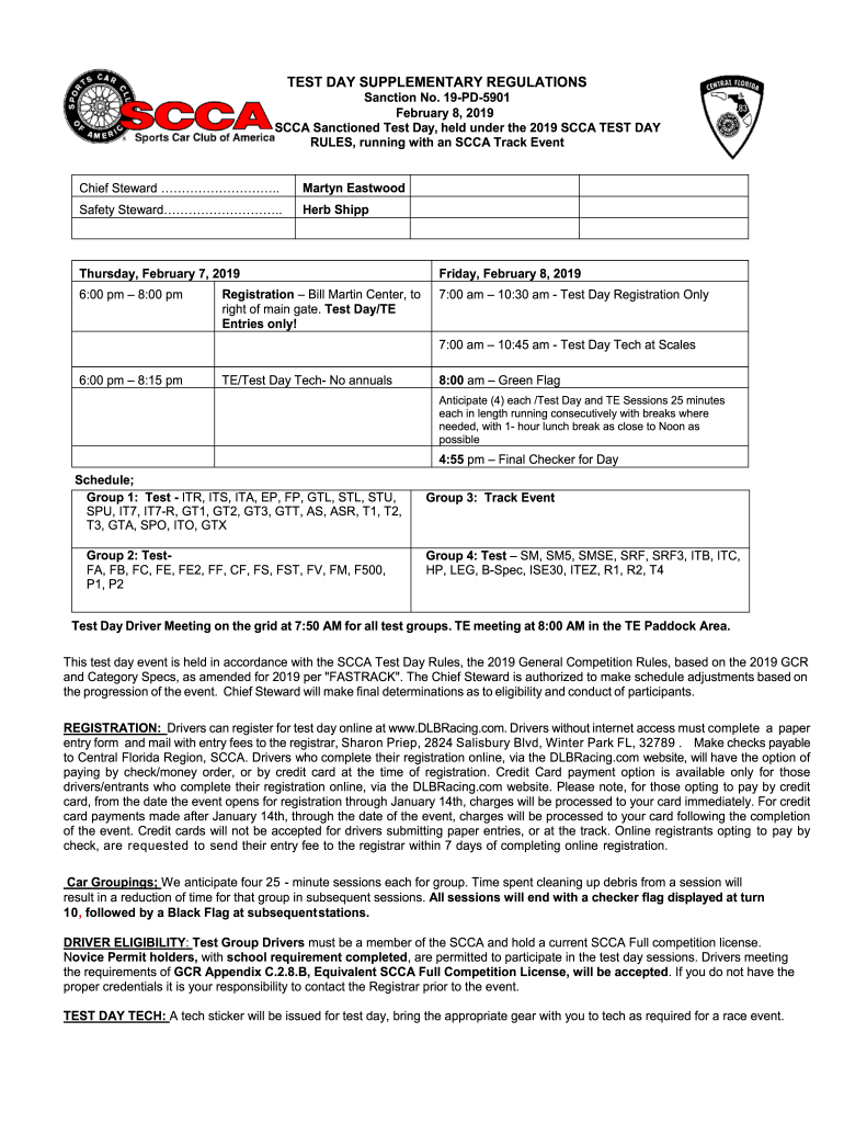 TEST DAY SUPPLEMENTARY REGULATIONS Sanction No. 19PD5901 February 8, 2019, This is an CCA Sanctioned Test Day, held under the 2019 CCA TEST DAY RULES, running with an CCA Track Event Chief Steward.
