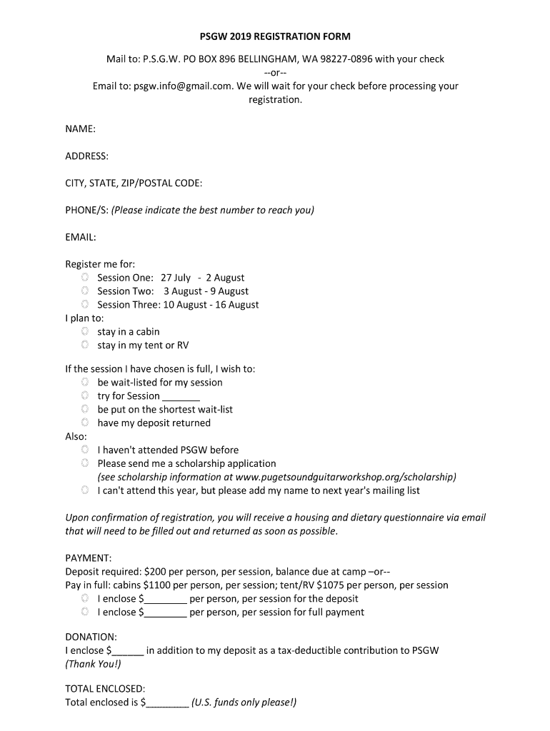 PSG 2019 REGISTRATION FORM Mail to: P.S.G.W. PO BOX 896 BELLINGHAM, WA 982270896 with your check remain to: PSG.info gmail.com. We will wait for your check before processing your registration. NAME: