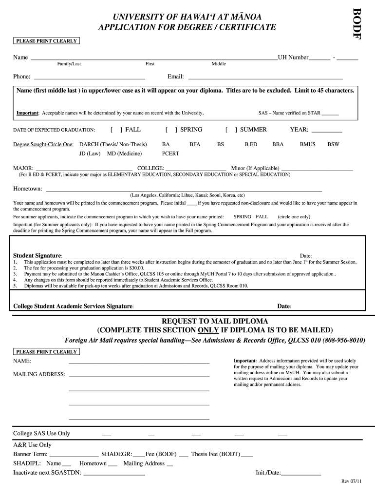BODFUNIVERSITY OF HAWAII AT MNA APPLICATION FOR DEGREE / CERTIFICATE PLEASE PRINT CLEARLYName UH Number Family/LastFirstMiddlePhone: Email: Name (first middle last) in upper/lower case as it will