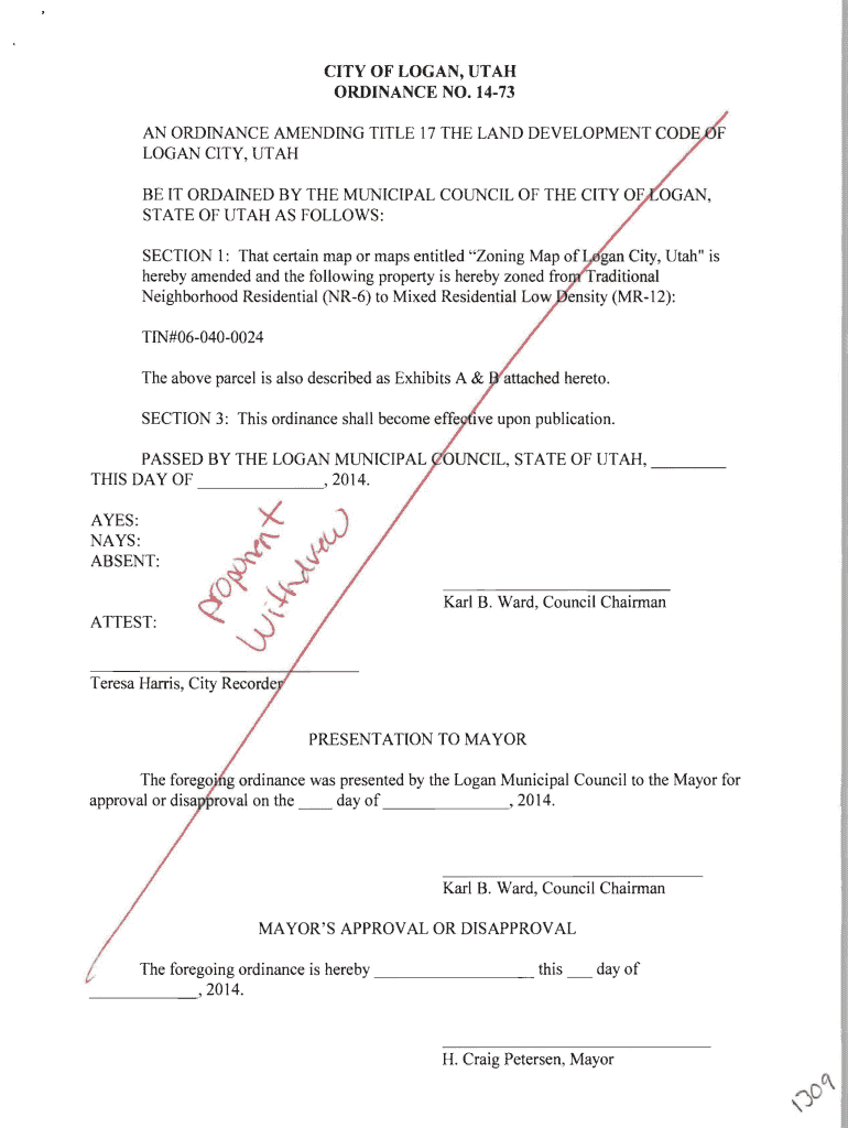 CITY OF LOGAN, UTAH ORDINANCE NO. 1473 AN ORDINANCE AMENDING TITLE 17 THE LAND DEVELOPMENT CODE LOGAN CITY, UTAH BE IT ORDAINED BY THE MUNICIPAL COUNCIL OF THE CITY OF STATE OF UTAH AS FOLLOWS: SECTION