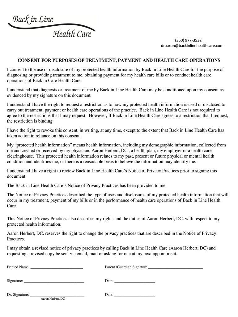 draaron@backinlinehealthcare.comCONSENT FOR PURPOSES OF TREATMENT, PAYMENT AND HEALTH CARE OPERATIONS