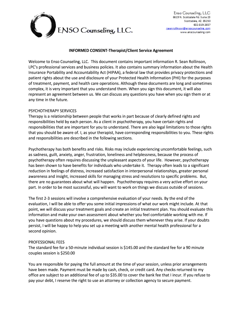 Welcome to ENSO Counseling, LLC. This document contains important information R. Sean Rollins on,